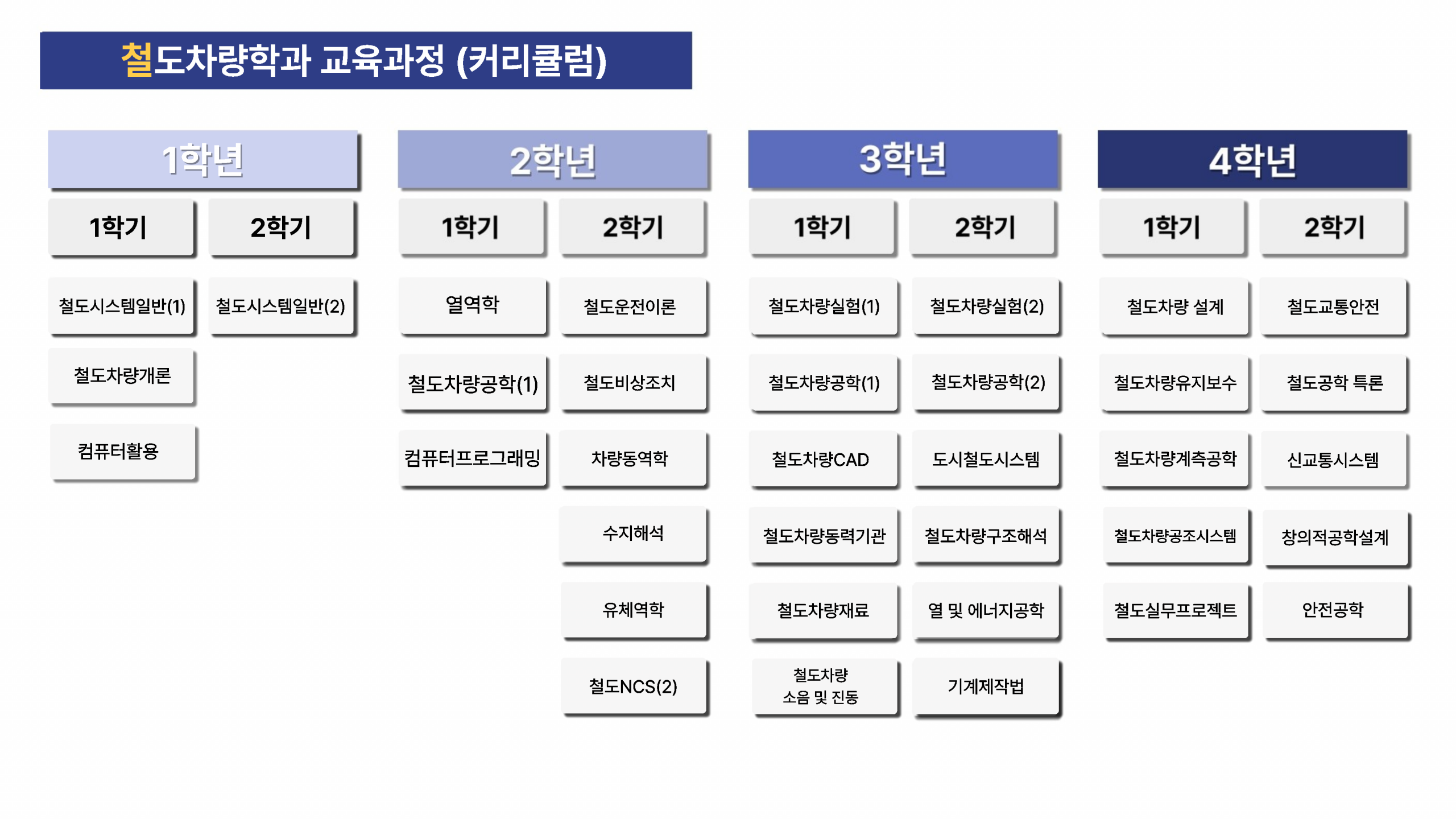 육상수송을 분담하고 있는 자동차와 함께 철도가 차지하는 비중이 점차 증가하고 있다. 철도에 대한 기본적인 개념과 철도수송의 중요성을 이해하고 철도의 건설과 이를 활용하는 차량의 일반 및 철도관련 제반 설비의 제작, 유지보수에 필요한 기초지식을 습득하기 위해 개설된 교과목이다.